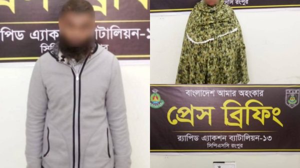 স্টাফ রিপোর্টার। রংপুরে র্যাব-১৩-এর অভিযানে ৮ কেজি গাঁজাসহ দুজন মাদক ব্যবসায়ীকে গ্রেপ্তার করা হয়েছে। শুক্রবার (২ জানুয়ারি) দুপুর ১২টা ৫০ মিনিটে রংপুর মহানগরীর কোতোয়ালি থানার ৩০ নম্বর ওয়ার্ডের জি এল